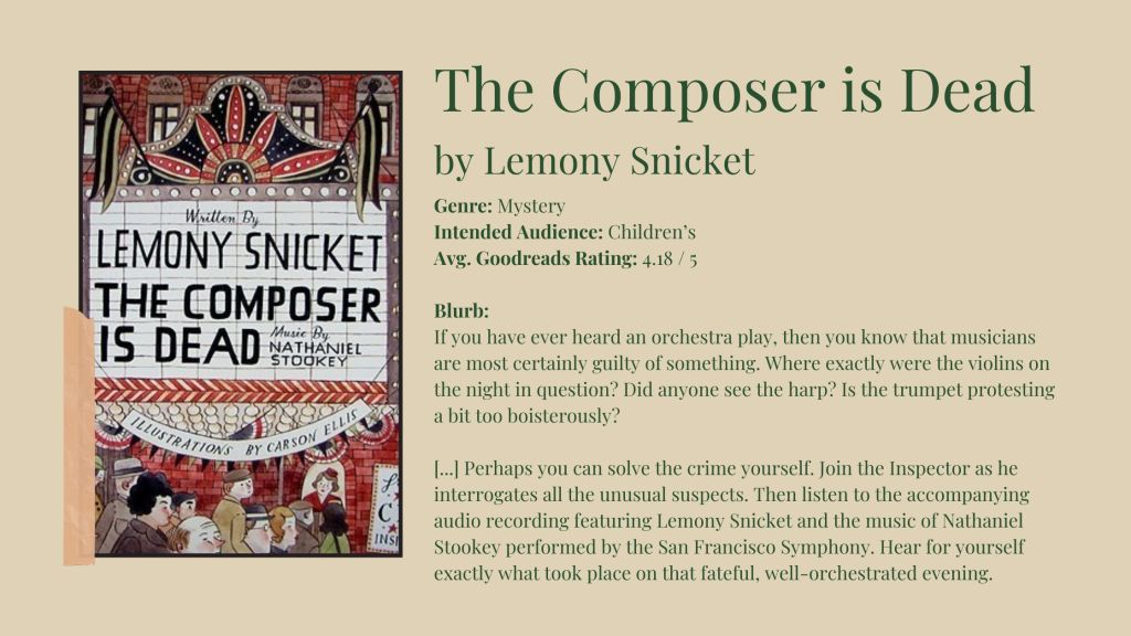 When I ordered The Composer is Dead, I hadn’t realized it was a picture book — but I don’t mind! It has an accompanying CD that I believe plays into the story so I’m thinking this will be a nice, quick little activity when I catch some down time. In case it isn’t apparent, Lemony Snicket is one of the closest authors I have to an instabuy.