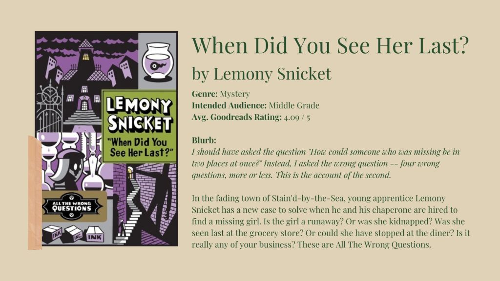 As previously mentioned, I love A Series of Unfortunate Events. Those books had a huge influence on me growing up, and I’ve spent the majority of this year getting back in touch with the inner child in me by reading a great deal of middle grade fiction in general. Because of that, I figured it was as good a time as any to pick up the All the Wrong Questions books. I’ve not started any of them yet but probably will in the next few days — my Goodreads reading challenge could use a few more additions…