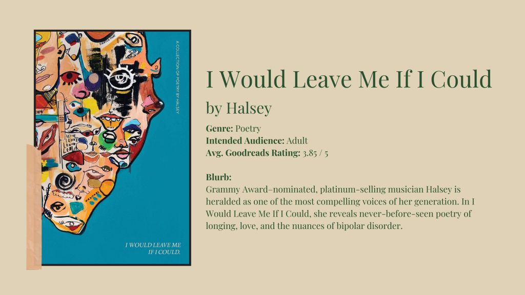 As a big fan of Halsey’s music and lyricism, adding her poetry collection, I Would Leave Me If I Could, to my to-read shelf was a no-brainer (even though a significant portion of the reviews are mediocre if not negative). However, I’ll be removing it from my to-read shelf and adding it to my “digital TBR” as I actually have a copy of it on my Kindle presently.