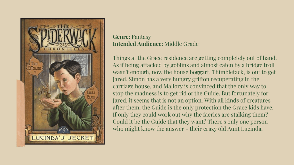 Riding the high of finishing The Stepford Wives, I picked up Lucinda’s Secret (the third installment of The Spiderwick Chronicles) — a jump that doesn’t make sense thematically, I realize, but makes sense in that I wanted a quick, engaging read. And quick it was! The world and stakes expand a bit in this one compared to the first two which was fun. I also wound up a tiny bit inspired to maybe work on a children’s story upon finishing it which is a nice bonus!