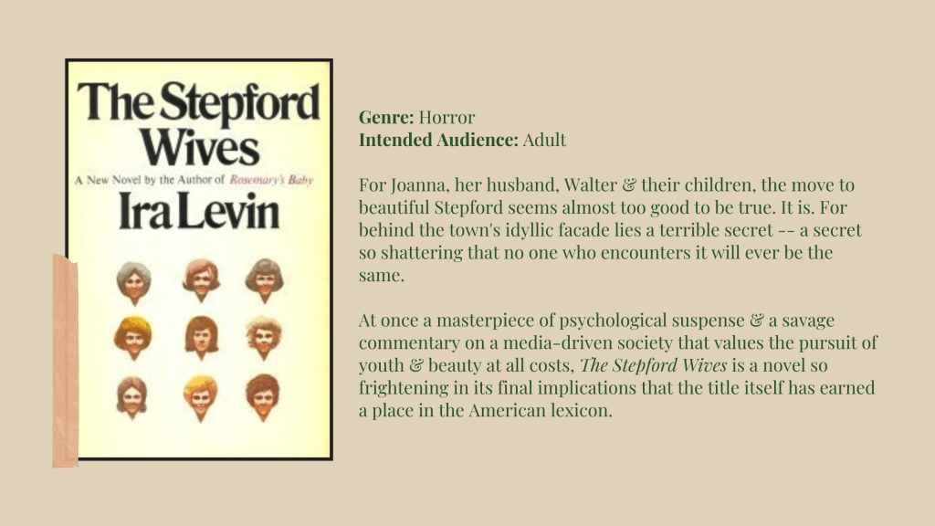 I’d had The Stepford Wives on my physical TBR for quite a while before moving it up to my “intensive TBR” more recently (along with Rouge, it’s a sort of “read-alike” to a new writing project I’m hoping to start this fall). Even if I hadn’t sought it out for inspiration, I would’ve been glad to have read it! It’s such a haunting and effective novella. A part of me wishes there was a little more explanation towards the end of the story about the how and why of things but I can see how the more succinct conclusion serves the book more than not. Good stuff!
